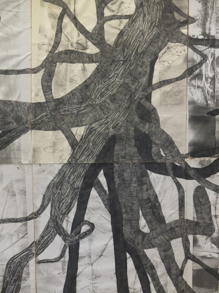 As an illustrator, Elsa Tate’s work grows from a deep fascination with the unseen and the natural world, blending storytelling with immersive experiences in a way that feels instinctive and alive. Their work is drawn from a deep fascination with trees and the hidden world beneath them; a living, breathing web of roots and fungi, where silent conversations unfold in the dark, just beyond the edge of our perception. This invisible language inspires them to explore experimental printing techniques, allowing “chance” to play an active role in shaping the direction of their work.
