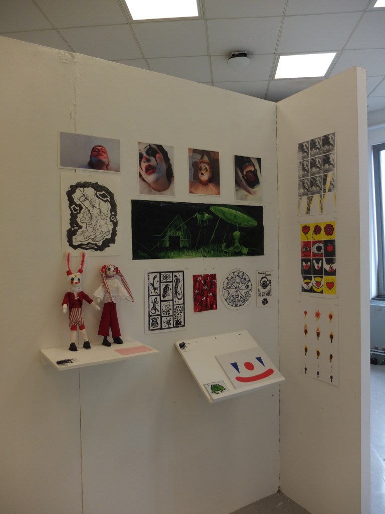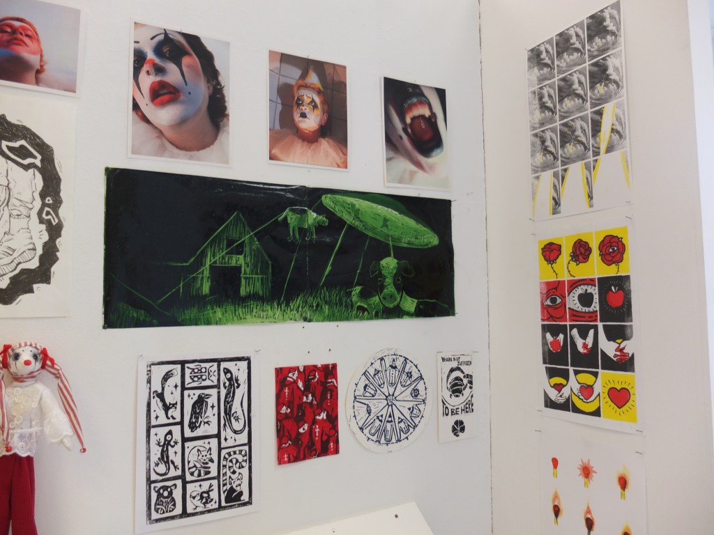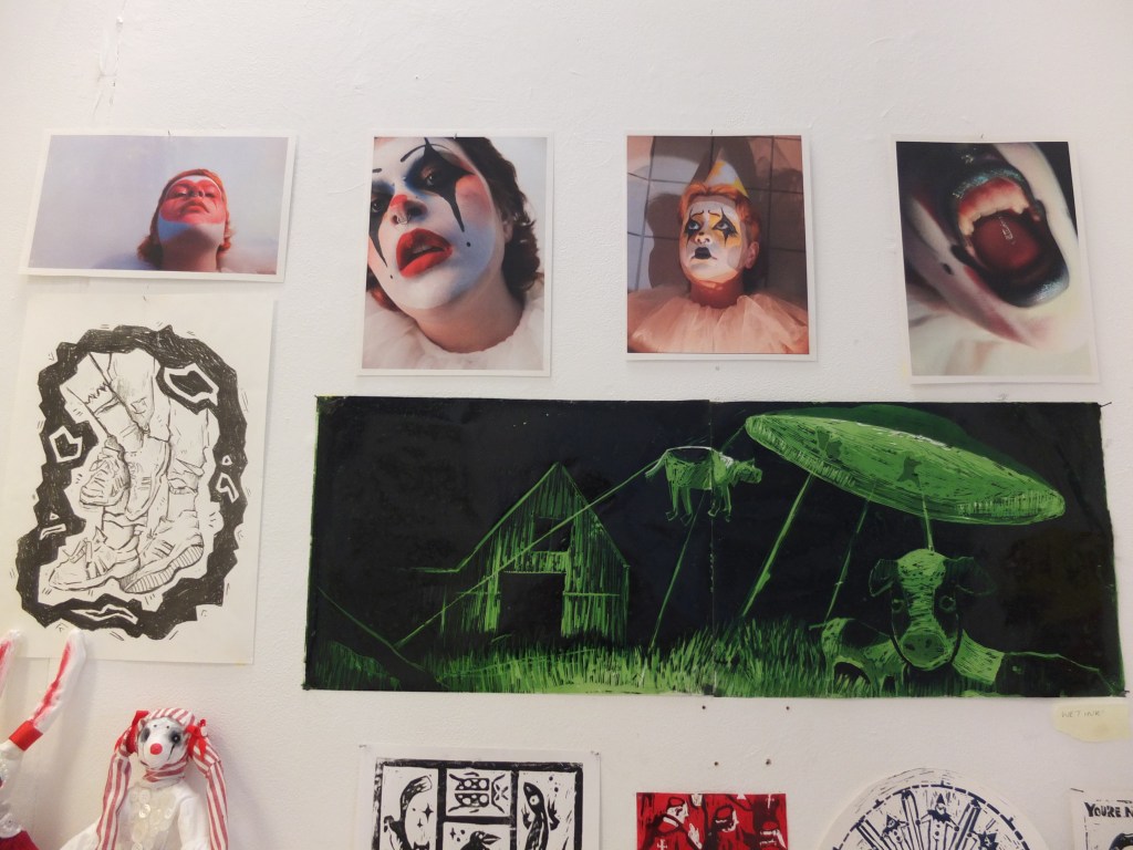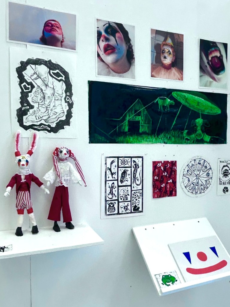 Will Osborne is a multi media artist, with a focus in printmaking, photography and textiles. Their work for the exhibition focuses on clowns, using their iconography to explore ideas of gender, identity, performance, and expression, drawing from their experience studying at the University of Brighton, and at the Minneapolis College of Art and Design. Also displayed at the exhibition is some of their original lino cut and lithographic prints, an art book, and art dolls.